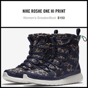 NEW NIKE ROSHE ONE HI PRINT SneakerBoot Comes with Box, Never been worn. Part of the Nike X Liberty Collection. Size Women's 7.5 Beautiful print design, Liberty Art Fabrics - Liberty of London; color is like a deep plum, almost navy color, Black and Tan colored print. Features a warm faux-fur lining, water repellent materials and lightweight Nike arose One sole. Adjustable collar and boot inspired laces for a snug, adjustable fit. See photos, and check out Nike's website for more info.