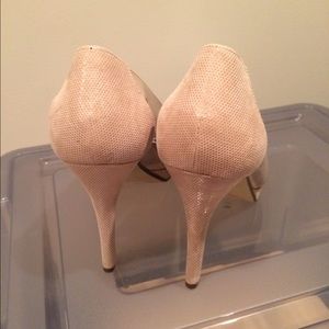 Never worn Alfani platform pumps in size 10, medium width, color nude. Has a 4 inch heel. Open toed. Mix of high gloss plastic and slightly patterned suede on the heel