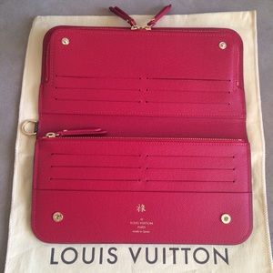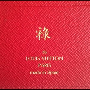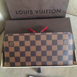 100% guaranteed authentic Insolite wallet in damier ebene canvas with cherry red leather interior. Purchased from Fashionphile in new condition and I used it for approx 2 months. Comes with dust bag, box, textile card, fashionphile tags & dustbag, plus repair paperwork from having it personally sent to have the edges reglazed. It has been hotstamped by LV with the Chinese character for Good Fortune. Date code CA3115.