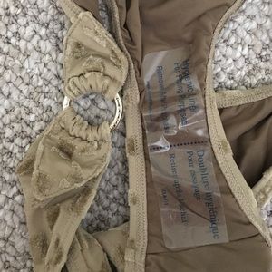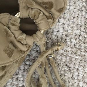 Bottoms (S) top (XS), super cute, bandeau bikini set, halter strap attaches from middle of top (not sides) and is removable. Rings have a bow-like styling and rings write "Marc by Marc Jacobs" ends of halter strings are "screws" that also write Marc by Marc Jacobs. I loved this swimsuit and got it, thinking I could handle an XS top, but it ended up being too small =[