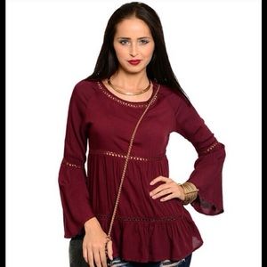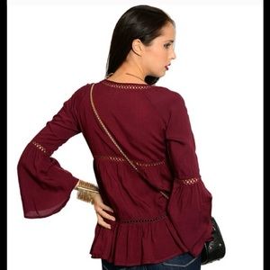 Lovely burgundy top has tiered cutout with crisis cross horizontal panel trim. Unique flared sleeves. Fabric content: 100% Rayon. Color burgundy. ❗️LAST ONE IN XS❗️