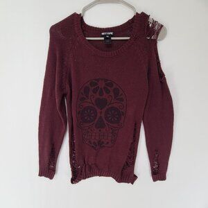 57. HOT TOPIC Women's Burgundy Distressed Acrylic Knit Sweater Skull Size M