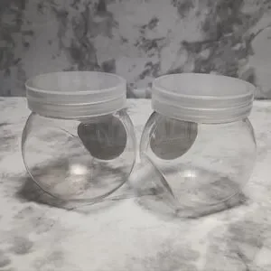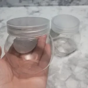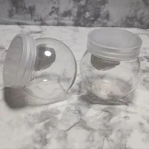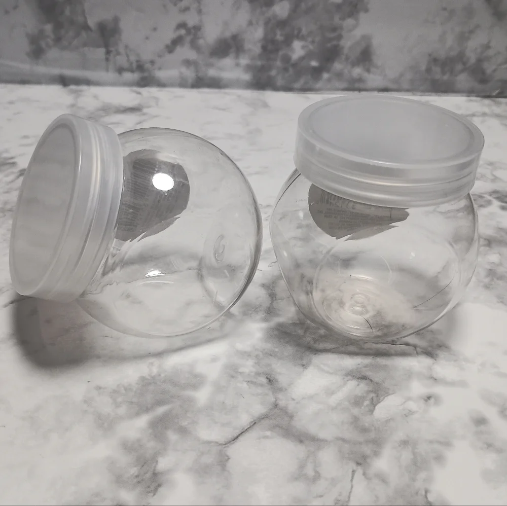Set of clear plastic storage jars with white lids. Perfect for organizing small items.
