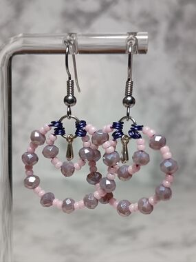 Delicate pink beaded hoop earrings with faceted beads and navy coil accents. Lightweight, feminine design that adds a soft pink pop to any outfit. Comfortable ear wires for all-day wear.