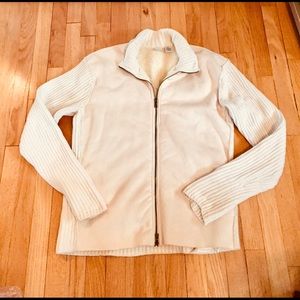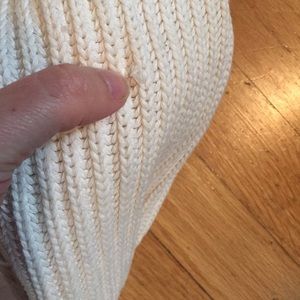 Cream colored sweater, material is thickly woven and weighted. Cotton sleeves and back. The front is polyester. Very warm. Two small pulled areas, as per the third picture. Additional pull of similar size to the left bodice of sweater.