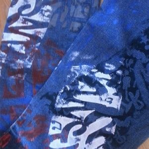 They're much cuter on than pictured! Definitely not your every day jeans...perfect for concerts and festivals or even halloween. Handmade screen printed with blue, red, silver, white & black. Enhanced with grommets & silver chains as the belt which are continued by draping on either side. Leather grommet trim hung on both sides with silver pyramid spikes. 5th photo of me wearing them to give you an idea. If they still fit, i would def kerp them but unfortunately i wont ever be that skinny again