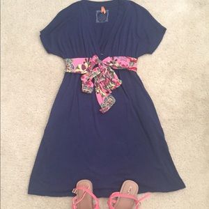 Super cute navy dress with pockets. Made of a soft stretchy material that is perfect for so many occasions! Deep v neck so I modeled the dress with a white camisole underneath. Pinkerton brand sold at Anthro....great quality, gently used! Let me know if you have any questions!!