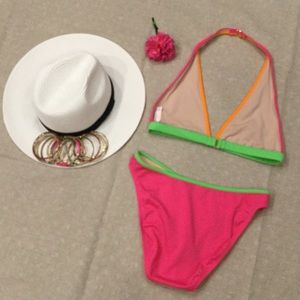 Such a Fun Bikini from Victoria Secret. Halter style top is in size M and moderate bottoms in size M as well! You will love wearing these happy colors as you're out for your morning walk on the beach! Never been worn!