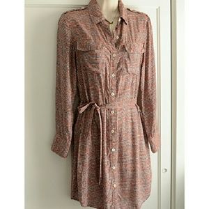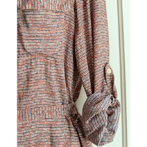 This is an adorable shirtdress/tunic (depending upon your height) by Tylho, sold at Anthropologie, red, blue and white Boho-pinstripe pattern and optional roll-tab sleeves. Measures 34" in length (sides are a nano-fraction shorter, as this style has a beveled hem) with a bust measurement if 18". Comes with the same pattern belt, but you can certainly snazz this up with one of your own choosing. Great with boots and leggings!