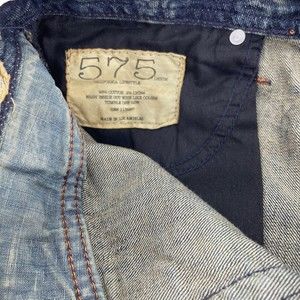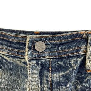 575 Denim Womens Size 30 Distressed Weathered Boho Frayed Hem Denim Jean Straight Skirt. Has a beige/yellow tint to it. Just Above Knee Length. Button looks like a Penny.
