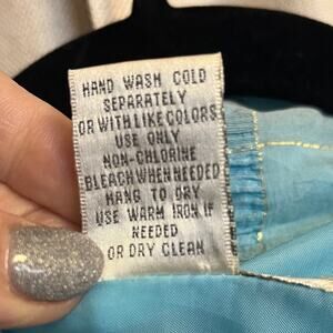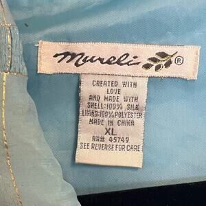 This jacket is so cool! 100% silk. Please note the left sleeve is missing a button and there are two very small discoloration spots on the chest that look like they should come out with a spot clean.