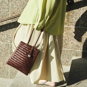 The Flat Basket Bag is an ode to expert craftsmanship and bohemian aesthetic. Natural dyed leather strips are handwoven into a flat silhouette with braided texture and finished with long straps designed to be carried by hand or in the crook of your elbow. Its roomy interior will fit your phone, sunglasses, cards, and gloss.This is an artisanal product made of vegetable tanned, naturally dyed leather. Each basket is entirely crafted by hand and no two pieces are alike. If you find any curves in the weaving or shifting in the tone of color, they are signs of the artisanal nature of the production and not a manufacturing flaw.