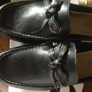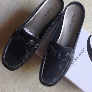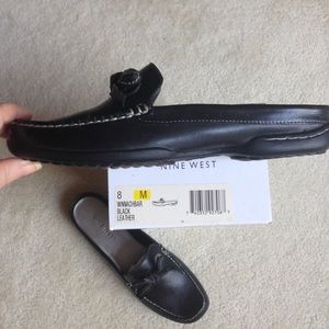 Solid black with light contrast stitching and cute bows! "Wnnachbar" style by Nine West. Leather upper, ribbed man made sole. Note there are a few scuffs as per last pic from the store - however these are new, never worn. I planned on wearing these for work at trade shows, etc, with pants and it didn't bother me, I bought them as they were so cute & comfy. Love the slide style dressed up a bit yet still so comfy, especially if you're on your feet all day!