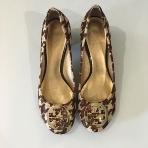 So gorgeous and perfect dressed up or down! Brown and cream printed pony hair with gold TB logo. Stacked gold embellished heel. Like new with one tiny flaw as shown. Size 9.5. This is the only pair of these available anywhere online in this size. No trades!! 06201640gwf