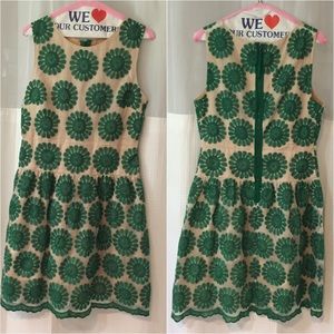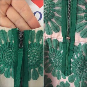 This vintage-inspired dress is a showstopper! Large green blooms are embroidered on delicate light fabric with a nude lining.