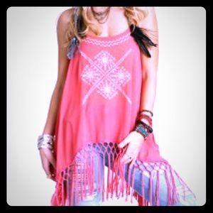 Coral Fringed Top. Embroidered with spaghetti straps. Fits loose and sheer. 🚫 trades