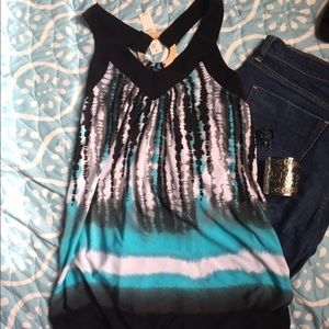 Such a cute top - teal, black and white with wooden ring detail on the back. New with tags.
