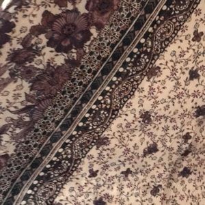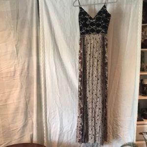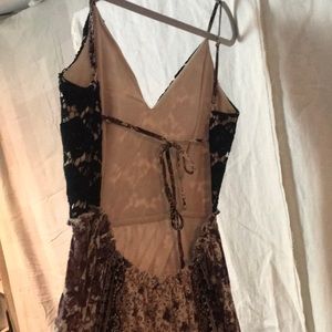New with tags brown tones with greys black and a hint of light pink with cream and black crochet lace top and open back very long inseam 52 ' from waist drop