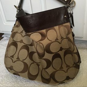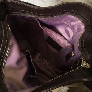Large slouchy shoulder bag with zippered pocket and small opening. Large shoulder drop because of the slouch.