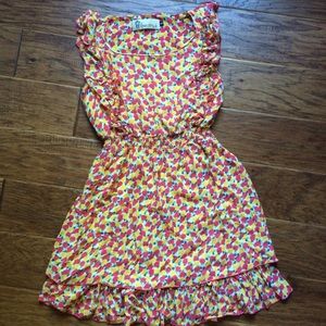 This dress is so cute. The skirt part is 2 layers. Inside lining has a few snags, but isn't noticeable when worn. There are a couple places where the decorative seam has detached from the ruffles, but it's not very noticeable (see pic). B 17" elastic Waist 22" L 30" Hip 38". From waist to hem is 18".