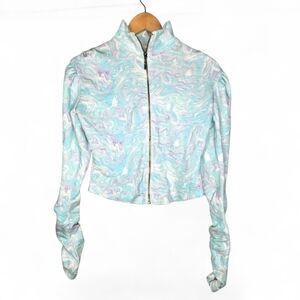 Gorgeous dress from Plenty by Tracy Reese. Bold aqua and black stripes with a watercolor floral design on the skirt. Ties in back. Sweetheart neckline with solid black ruffle. Puffy cap sleeves. Back zipper. Lined. 6" slit on the back.