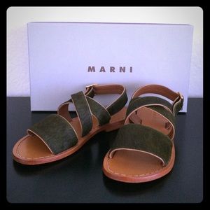 From Marni's Resort 2016 collection. A departure from the more streamlined cross-front fussbett sandal with a flat and slim footbed in green calf hair.
