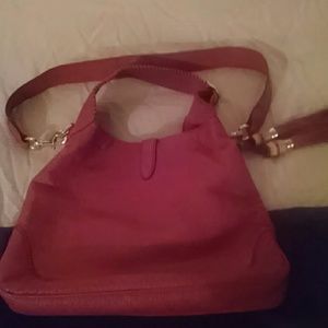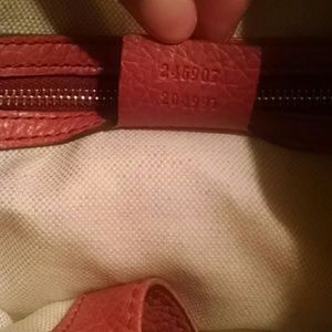 Genuine Gucci new jackie with removable strap. Only carried once! Bag looks new. No signs of wear tear, no interior stains, smells. Color is coral or salmon. Retail $3000. Approximate measurements in inches: 14 W x 11 H × 2.5-3 D. Reasonable offers considered. Use offer button.