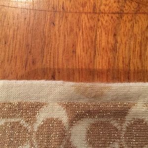 Metallic gold Coach scarf. Has small spot on the edge (see last 2 pictures) but I'm not sure how because I haven't taken it out of the box since I bought it. Only worn once. Excellent condition other than the small spot!