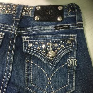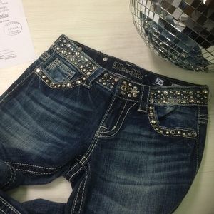 These are loaded with bling! These size 26 Miss Me's have various sizes of studded rhinestones and solid studs on the entire waistband. You won't need a bling my belt with these ladies. The bling continues on the tab top back pockets as well. Lots of top stitching in the pockets too. Studs and rhinestones run along the front pocket openings. Medium wash boot cut jeans. These are I. Excellent condition, not a stone missing. Waist measures 13.5 flat across the front inseam is 34-1/4"