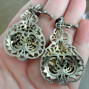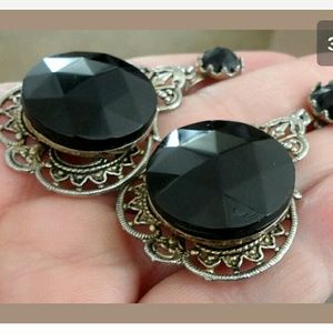 Vintage 1940s Art Deco Silver Filigree & Black Faceted Glass Crystal Dangle Drop Earrings- Estate Jewelry in EXCELLENT VINTAGE CONDITION....ENJOY!