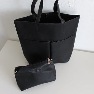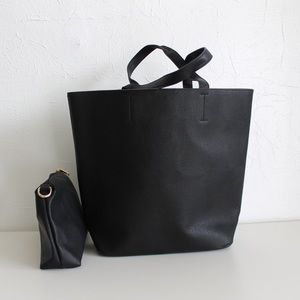 Large black tote bag featuring two large outer pockets. It includes a free complimentary matching makeup/accessories bag with gold hardware. It is definitely large enough to fit folder and magazines (great school bag) also a great weekend bag. If your the type if person thats always on the go with a lot to carry this tote is for you ππ½