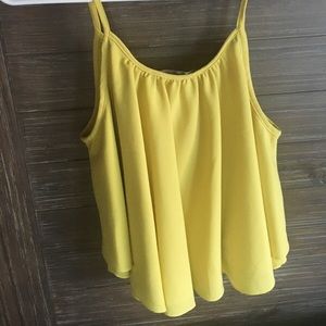 100% Polyester. Bright Yellow Thin Strapped Flowy Top. Two Layers. BEAUTIFUL!! Very Comfortable! Hand Wash Cold. Hang To Dry.