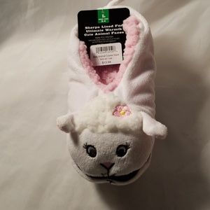 A brand new with tags pair of Kids Cozies Little Lamb Slipper. Tags reads "L" Shoe size 3-4. Very cute white lamb slippers lined inside with fluffy pink sherpa. The lamb has a pink and yellow flower in her hair.