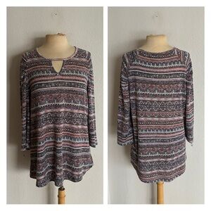 Damask print dress. 96% polyester/ 4% spandex. Super soft and stretchy! Bell sleeves. Absolutely gorgeous- photos do not do this justice!