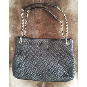 Authentic Tory Burch black leather shoulder bag measures 10 inches by 10 inches with 3 inch depth.