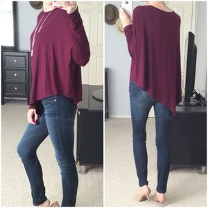 Love this rich color! Plum long sleeve top with asymmetric hem on bottom. Boxy fit with wide dolman sleeves. Slit on longer side. Very soft and stretchy. Perfect for layering. Modeling small. 70% cotton 30% rayon.