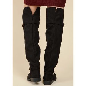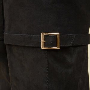 Adorable just above the knee faux suede boots. Gold buckle details. Zipper closure. Heel measures 1.25", shaft is 22" tall and 18" in circumference. All man made materials. These are brand new in the box. Didn't fit me and I forgot to return. They're so cute!