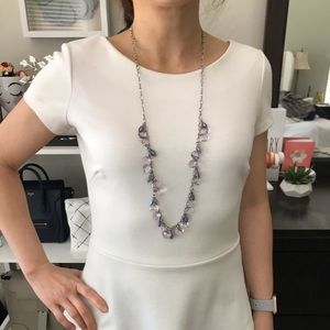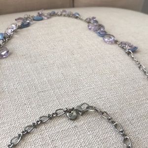 Gently used a few times is this long LOFT long necklace with blue and clear crafted beads in ruthenium (dark) silver chain. In excellent condition.