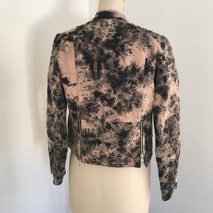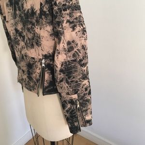 Like new black and tan tie-dye cotton twill moto jacket by 3.1 Phillip Lim. Shiny silver hardware. Asymmetrical two-way-zip front with snap buttons at collar. Two front zip pockets detailed in black leather. Zippers at the sleeve hem, two vertical zippers at the back waist. Padded, stitched detailing at shoulders and upper arms. Lapels are lined in black leather, rest of body lined in black poly-cotton. Size 4. Excellent condition. I am original owner. Purchased from Barneys New York.