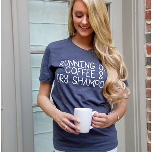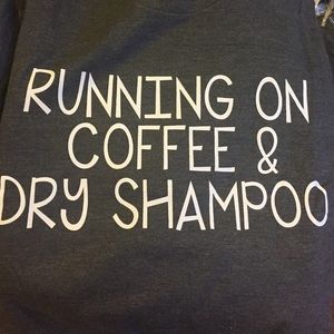Story of my life! This is a super cute crew neck relaxed fit short sleeve tee with "running on coffee and dry shampoo" graphic in white. These are super soft, comfortable & preshrunk tees - very nice quality. The model in photo one is wearing the small. S-XL available. Price firm unless bundled. Mackenzie is in the small