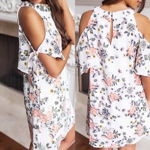 Adorable ivory white flower print dress with smocked neckline detail, open shoulders, and short flutter sleeves with tie detail. Small keyhole back detail with top button closure. Dress has side pockets that must be seam-ripped before wearing.