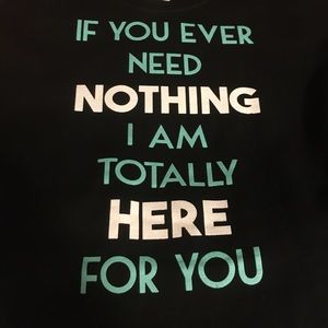 Funny pullover sweater. More sizes coming soon. "If you ever need nothing I am totally here for you" size M. Measures approx. 27 long & 21" wide (armpit to armpit) 50% cotton, 50% polyester. Since this item is from my boutique it will not come with tags from a store.
