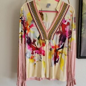 This adorable lightweight slub knit top has a delicate crocheted yoke that extends to the back shoulders. The back of the shirt is laced up and open from the mid-back to the hemline (see first photo). Very pretty and feminine and a perfect summer top to pair with shorts or cropped jeans. The mannequin is wearing 1X. Fit is TTS.