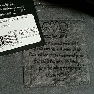 A Peace Love World beautiful grey hoodie. "Love the people around you and be happy" Zip front with kangaroo pockets. Exceptional construction with high quality fabric. NWT The pictures do NOT show the true gray this hoodie is. The first photo is the best in terms of the color gray. Price is Firm.