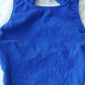Blue one piece with hook on back. In great condition. Also have some stretch to it.