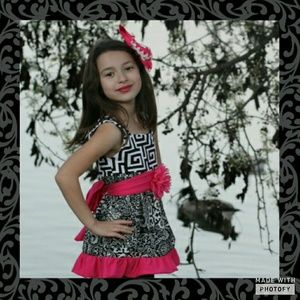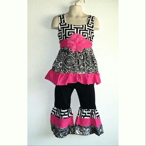 Comes with top, pants and belt. Top has beautiful bold design with black and white with a pop of pink. Pants are black with elastic waist and beautiful ruffled pattern bottoms. Boutique Quality and design. 100% cotton PERFECT GIFT IDEA