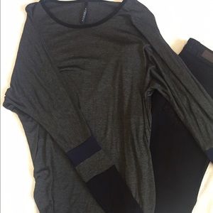 Color block tunic. Long sleeves in charcoal, black and blue; matches anything. Ruched at sides for feminine look. Comfortable style but classic and cute. 95% viscose 5% spandex. Soooo comfortable!