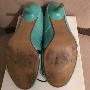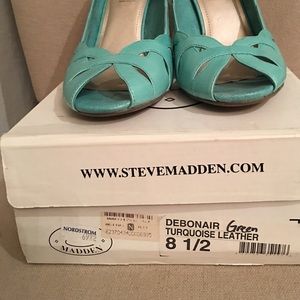 Turquoise pep-toe pumps by Steve Madden. Gently used. Scuff on heel shown in picture. Heel heigh 3 3/4 inches