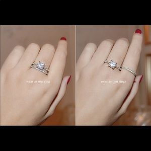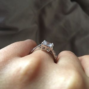 Cubic zirconia and absolutely STUNNING. Size 5. Brand new never worn. Purchase comes with band as pictured as well. Has a slight engrave of 925 on the inside it's just hard to see it when I try to take a picture of it. This might be a good option to take on Vacation with you if you fear to take your real expensive diamond
