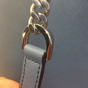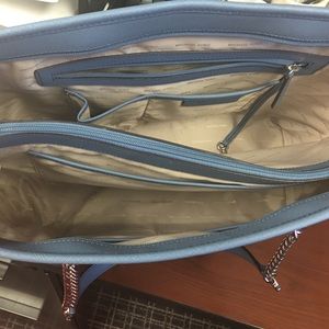 Gorgeous Michael Kors Blue Tote. Muted blue- almost a bluish gray color. It is large- would easily fit a laptop. Plenty of pockets and dividers inside! Top zips fully closed. I just purchased this bag one week ago- but it's a little large for my daily use. One very minor scrape on the hardware- see last pic- otherwise PERFECT. *Reasonable* offers considered- but please consider this bag has only been used for one week! ☺️☺️💕
